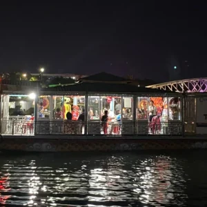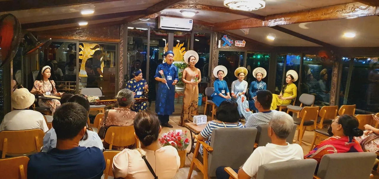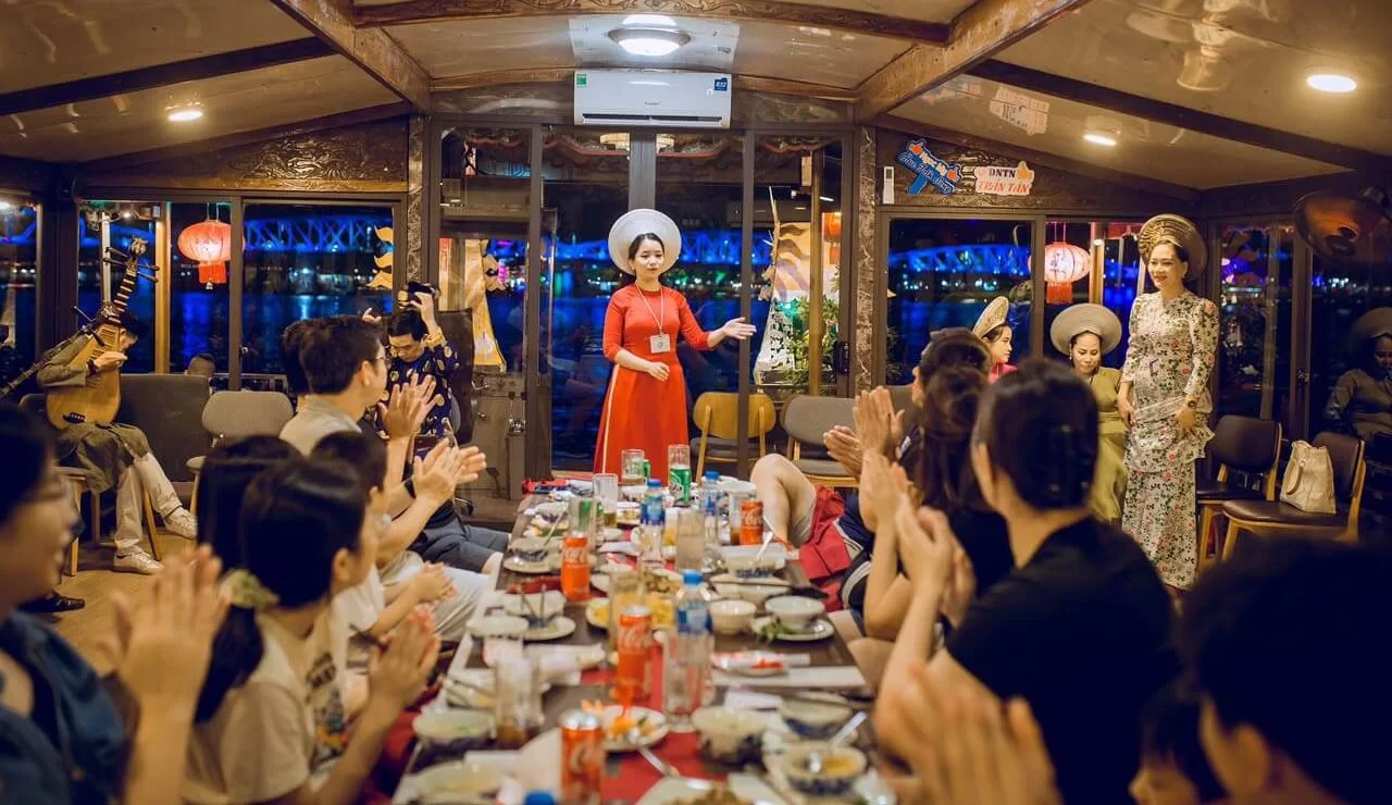 Trên thuyền rồng, du khách sẽ được lắng nghe những làn điệu ca Huế sâu lắng, do các nghệ nhân tài hoa biểu diễn. Tiếng đàn, tiếng hát vang vọng giữa không gian tĩnh lặng, tạo nên một bức tranh trữ tình đầy mê hoặc. Bên cạnh đó, du khách còn được thả hoa đăng trên mặt nước, gửi gắm những điều ước bình an và chiêm ngưỡng cầu Trường Tiền rực rỡ trong ánh đèn đêm.