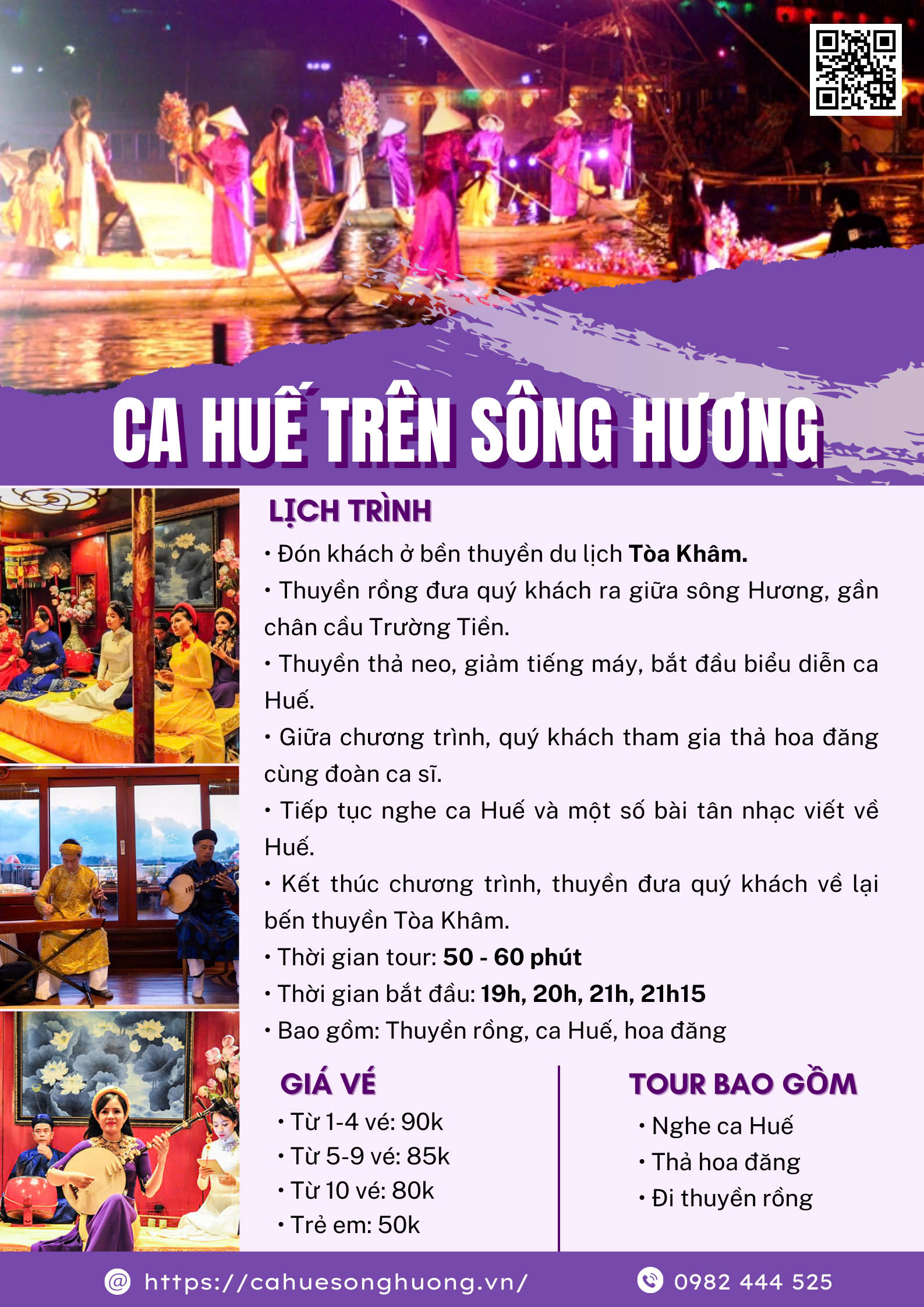 “Nghe ca Huế trên sông Hương” là một trải nghiệm văn hóa đặc sắc, kết hợp giữa thưởng thức âm nhạc cung đình và thả hoa đăng trên dòng Hương Giang thơ mộng. Đây là hoạt động thu hút nhiều du khách khi đến Huế, mang đến cảm giác thư thái, hoài niệm giữa khung cảnh lung linh của thành phố về đêm.